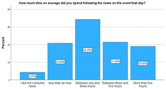 Finally, when asked how much time, on average, the respondents spent following the news during the day of the attack, 44.4% stated three or more hours, 34.3% between one to three hours, 20.8% less than an hour, and 4.4% not at all (see Figure 5).
