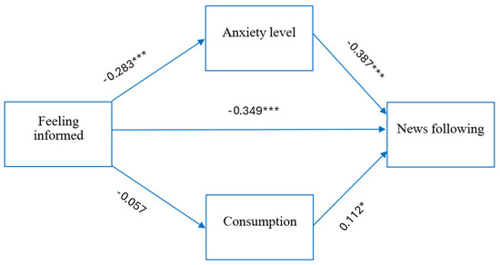 Mediating role of anxiety level and consumption in the relationship between feeling informed and news following. Note: * p < 0.05, *** p < 0.001.