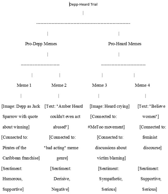 - Memes that reference specific events would then link directly to the relevant subcategory node (e.g., “Meme 1”–(References) – “Depp Testimony Event 1”).
