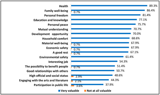 The responses provided by students can be considered illustrative of this viewpoint: “There are many values in my life that I consider important. The first of them are family, friendship, support and love of close people. The second value is education, it helps me to develop in life and acquire new skills. Health is very important—the key to physical and psychological well-being. And also such values as responsibility, respect” (Russian, female, 21 years old); “I consider my greatest value to be close relations with my family and friends, as emotional ties with people are very important to me, so the opportunity to have people close in blood or spirit is a necessity for me. The second most important value I consider the possibility of self-realisation. I believe that every person should find his/her place in life” (Polish, female, 19 years old).