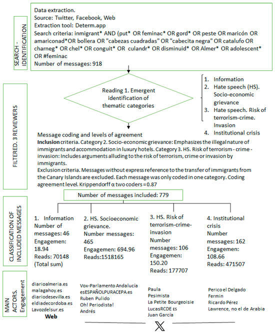 The “socioeconomic grievance” category refers to messages in which immigrants are presented as an economic burden on Spanish nationals. Such messages propose that immigrants are treated in an advantageous or privileged way. In the “terrorism–crime–invasion” category, messages are included in which immigration is associated with a potential increase in civil insecurity, as well as the threat of invasion. The “political destabilization” category includes expressions of institutional discontent and the disqualification of institutions, or the people who represent them, for having carried out or facilitated the transfer of immigrants. The “sexism/others” category refers to messages that emphasize rejection, related to sexist arguments or others, such as fatphobia. Subsequently, a second review was carried out focusing on messages considered hate speech, bearing in mind the possibility that the same message could be included in more than one category. Each message was coded with 1 to be included or 0 to not be included. In other words, sixteen categories of hate speech were established, plus another referring to “information” (Figure 2).