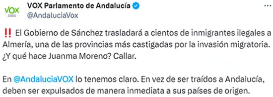 Publication by the VOX party about the news of the transfer [The Sánchez Government is going to transfer hundreds of illegal immigrants to Almería, one of the provinces most affected by the immigrant invasion. And what does Juanma Moreno do? He remains silent].