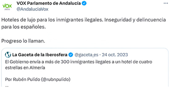 The intentionality is reinforced with a photograph of the hotel that creates an interpretive framing of luxury vacations. By adding an image of the hotel from the pool, the publication creates a framing that evokes the idea of luxury and vacations—the aim being to mentally infer that the transferred immigrants are being given privileged treatment. It is written by Rubén Pulido (a VOX influencer). The X accounts of the media outlet itself, @gaceta_es (which has 248,800 followers), and the author, @rbnpulido (with 91,000 followers), both publish this—with no additional comments—within an interval of half an hour (2:00 p.m. and 2:29 p.m.). At 2:46 p.m., the X account @AndaluciaVox (with 37,900 followers) retweeted the above news item (Figure 6).