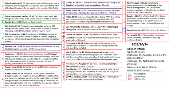 Thus, in order to set in motion the hate bubble that developed during the 24th, the discursive sequence began with several X messages. It continued with press reports that omitted the qualifier “illegal” to describe the immigrants, nor any mention of luxury accommodation; however, it carries on with intentionally biased journalistic communications that, through websites, were disseminated by some news media outlets. These “news” items are followed by an avalanche of messages across social media (mainly X) containing hate speech. A sample of the messages in this sequence is found in Figure 8.