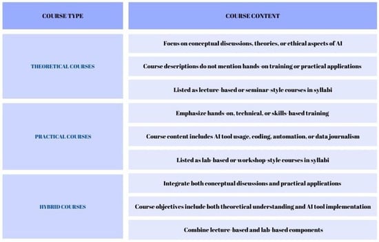 - Theoretical courses primarily cover conceptual discussions on AI ethics, media algorithms, and the impact of automation on journalism.