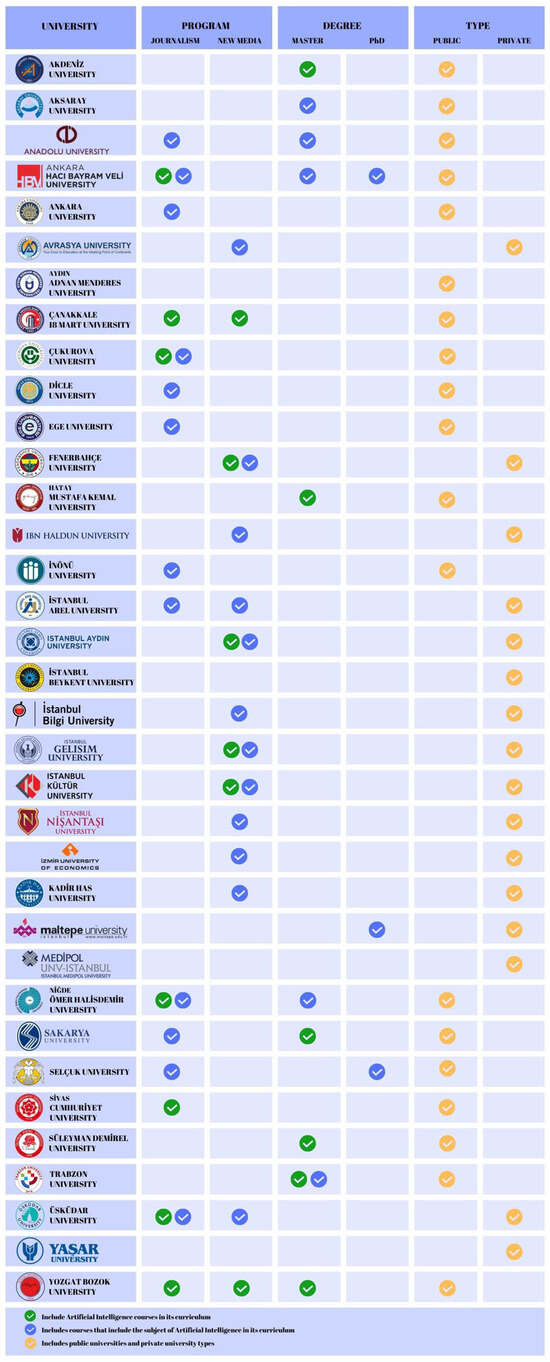 In order to present the current situation in detail, among the 72 journalism and new media programs examined, universities that include artificial intelligence courses and artificial intelligence-related course content in their curricula were classified according to their types and degrees (Figure 3).