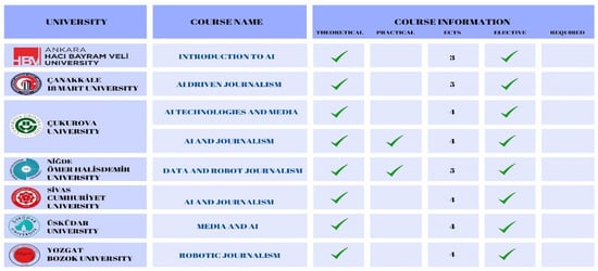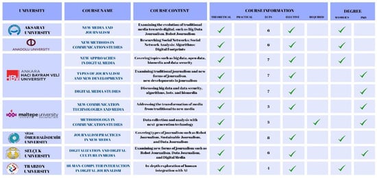 Figure 3 presents a comprehensive analysis of AI integration in journalism and new media programs at 35 universities in Türkiye, 19 public and 16 private, distinguishing between institutions offering dedicated AI courses and institutions that integrate AI-related content into broader topics. Universities marked with a green check provide standalone AI courses, while those with a blue check include AI topics as part of existing course structures. This classification highlights the uneven distribution of AI education across institutions, revealing significant variations in curriculum depth and focus.
