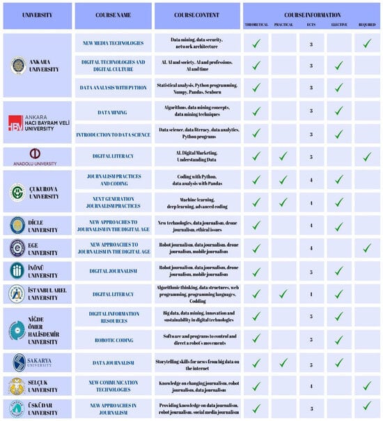During the data collection process, official websites, the Bologna Course Information Package, and other publicly available documents were used to access the curricula of universities in Türkiye. For universities where course content was unavailable, emails were sent to request the necessary information, and the responses received were included in the analysis.