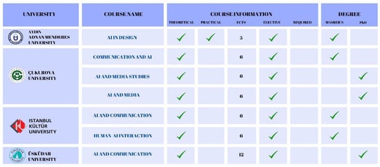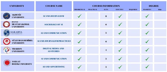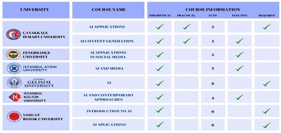 New media programs, which provide education on the rapidly evolving dynamics of digital communication and media production, are becoming increasingly common in Türkiye, with a total of 27 undergraduate new media programs available (Figure 2). The available data reveal that only 6 of the 27 programs examined offer a total of eight AI courses in their curricula (Figure 6). Of these courses, four are provided by private universities and four by public universities. Notably, among the universities incorporating AI courses into their curricula, there are four private universities compared to only two public universities. Considering that there are 22 new media programs in private universities and only 5 in public universities (Figure 2), the numerical majority of AI courses in private universities is to be expected. According to the data in Figure 6, AI courses in new media programs are divided equally, with four being required and four offered as electives. The variation in credit hours for required courses, ranging from 5 to 8, suggests that AI is recognized as a fundamental component of the curriculum in these programs. On the other hand, elective courses provide students with flexibility, indicating that AI curriculum integration in new media programs has not yet been consistently established and that course content varies across universities. Considering that new media departments focus on digital media education, it is evident that AI courses are still limited within the curriculum.