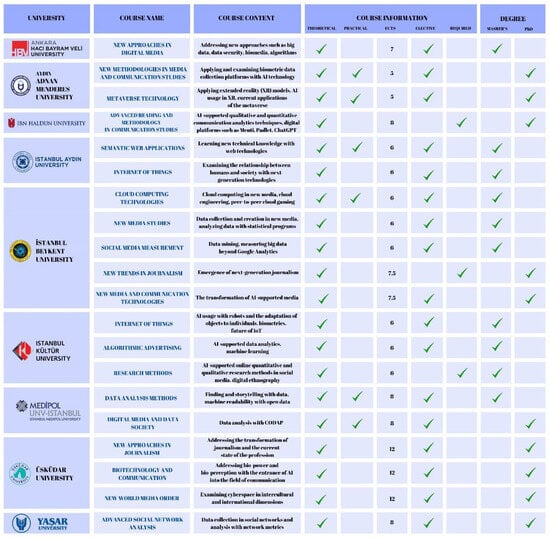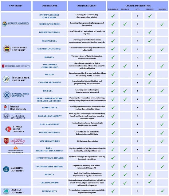 In addition to thematic classification, several key parameters were coded, including university name, course title, program level (undergraduate, master’s, doctoral), course type (required or elective), and institution type (public or private university).