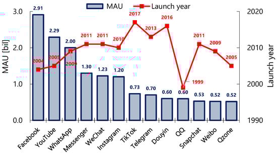 The authors were looking for a correlation between MAU and the presence of a given platform on the internet, but there was no such correlation (Figure 2). Figure 2 shows the top 13 social media (x-axis) platforms with the highest number of MAU (left y-axis, blue colour) and their launch year (right y-axis, red colour). The first top SM platforms were launched around 2010, and there is a slight correlation between the launch date and active users, but it is not a rule (e.g., QQ). Moreover, only 6 social media platforms have at least 1 billion MAU, most established around 2010. However, it must be noted that there are new SM platforms with an increasing year-to-year number of users, like TikTok or Telegram, established in 2017 and 2013, respectively. The newer the social platform, the lower the monthly rate of individual user logins on average; this may be related to users logging in once and not logging out (mainly using smartphone apps) for “convenience”. Over time, the use of social media changes, so an indicator in the form of the number of logins becomes unreliable.