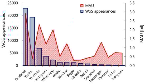 Today’s most popular social networks are Facebook, Instagram, and TikTok (). This is due to publishers (primarily politicians) and users (political followers) directly impacting the formation of societies, including science. On the other hand, Messenger is the fourth biggest according to MAU, but it appears only 930 in WoS topics because it is just a person-to-person chat (communicator) and does not contain publicly available content (; ). The first social media platforms emerged in the early 21st century with the development of the internet, its speed, and accessibility, and after 2010, with the popularity of smartphones and tablets. Two of the first social media platforms were MySpace and Facebook, which were created in 2003 and 2004 (; ). Currently, there are several SM platforms in use, and they are becoming more and more popular (; ). In recent years, the influence of social media on various aspects of human life, including science, has been steadily increasing.