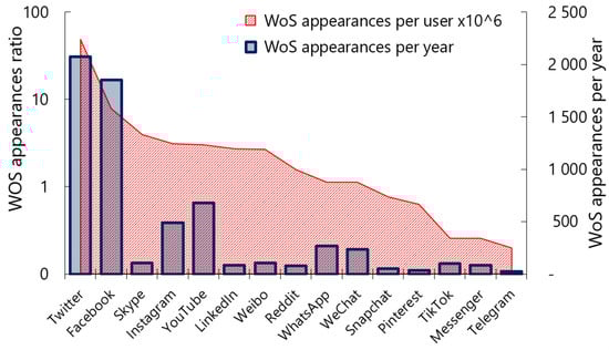 Figure 4 shows data similar to the previous figure, such as yearly WoS appearances, but also a WoS appearances ratio, which is calculated as the number of appearances. The ratio (left y-axis, ref) is calculated as the number of users per one paper in the WoS using a logarithmic scale to interpret the results better. The right y-axis shows how many WoS papers appear yearly since the year of the SM launches. The number of Twitter and Facebook mentions of scientific articles in the WoS per individual user of these SM platforms indicates their most significant impact on science. However, Twitter is ranked first in such terms. A comparison of the number of occurrences of the names of these two SM platforms in scientific articles in the WoS per year of their existence indicates the same positions in the ranking.