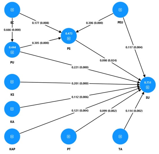 According to the findings shown in Table 4, each of the proposed hypotheses was confirmed. The study results revealed that EC is significantly correlated with PU (β = 0.666, p < 0.001), supporting the hypothesis H1. Similarly, PS was significantly predicted by EC (β = 0.177, p < 0.01), PU (β = 0.305, p < 0.001), and PEU (β = 0.306, p < 0.001), supporting the hypotheses H2, H3, and H9. Finally, the outcomes revealed that SU was significantly and positively affected by PU (β = 0.221, p < 0.001), PS (β = 0.098, p < 0.05), KS (β = 0.201, p < 0.001), KA (β = 0.112, p < 0.01), KAP (β = 0.121, p < 0.05), PEU (β = 0.117, p < 0.01), PT (β = 0.099, p < 0.01) and TA (β = 0.114, p < 0.05), supporting the hypotheses H4, H5, H6, H7, H8, H10, H11, and H12. See Figure 2. Out of all these independent constructs, the structural equation analysis revealed that PU most significantly affects SU because β = 0.221 (p < 0.001).