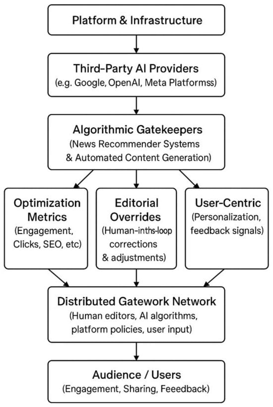We find that the classic gatekeeping function—filtering and selecting information to become news—is increasingly shared between humans and algorithms. Algorithms now influence each stage of news processing, from what events are detected (through trends or data mining) to how stories are ranked and distributed to audiences (van Dalen, 2024). In our framework, AI-driven gatekeeping is defined as the “influence of automated procedures on selecting, writing, editing, and distributing news”, paralleling Shoemaker et al.’s definition of journalistic gatekeeping (Shoemaker et al., 2009), Crucially, these algorithms (especially machine learning-based ones) operate at a scale and speed beyond human capacity and can introduce new selection criteria (e.g., personalization for user preference, or optimization for engagement) that differ from traditional news values. The gatekeeping process thus becomes a hybrid human–AI system, where editorial judgment and algorithmic logic intersect (Régis et al., 2024). This challenges linear models of news flow: instead of information passing sequentially through a series of human “gates”, we have a networked system of parallel and iterative gatekeeping actions by both people and code. Gatekeeping is no longer a unidirectional chain but a dynamic, decentralized process (Wallace, 2018) involving interactions between journalists, algorithms, audiences, and platform engineers.