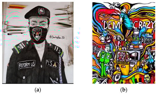 Samples of #EndSARS artworks exposing systemic corruption as the root of SARS’s brutality. (a) Brain Surgery, Artist: Darlington Okoduwa (Darlinton 3D); (b) DEMOCRAZY, Artist: Laolu Senbanjo.