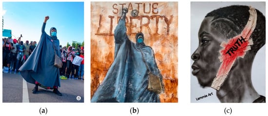 Samples of #EndSARS artworks advocating justice and human rights through moral outrage. (a) Protest Image of Aisha Yesufu, Artist: Victor Odiba; (b) Statue of Liberty, Artist: Tunde Lasisi; (c) Untitled, Artist: Bakare Omodara.