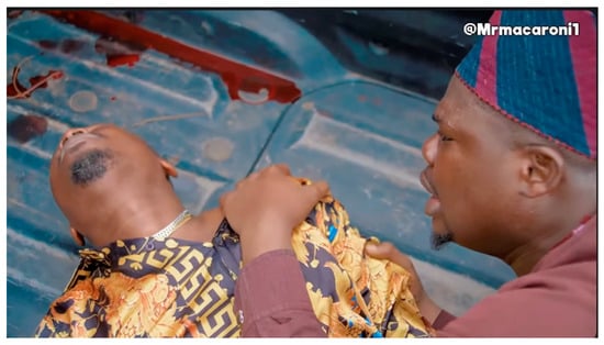 The skit features Mr. Macaroni as the “Daddy”, a dismissive father representing older-generation skepticism toward the #EndSARS protests, alongside his daughter Motunde, who seeks to join the movement, and his son Richard, who becomes a victim of SARS brutality (see Figure 5). The narrative unfolds as Mr. Macaroni mocks the protesters, labeling them “criminally minded” youths flaunting wealth without “9–5” jobs, while casually greeting SARS officers who reinforce his views. The tone shifts dramatically when the officers reveal a slain “criminal” in their truck, identified by Motunde as her brother, Richard. A flashback revealed Richard’s fatal encounter with SARS, triggered by his “shiny jewelry”, exposing the arbitrary violence Daddy had denied. Stricken, Daddy confronts the officers, holding his son’s body in a wrenching reversal of his earlier stance (see Appendix A for the full transcript).