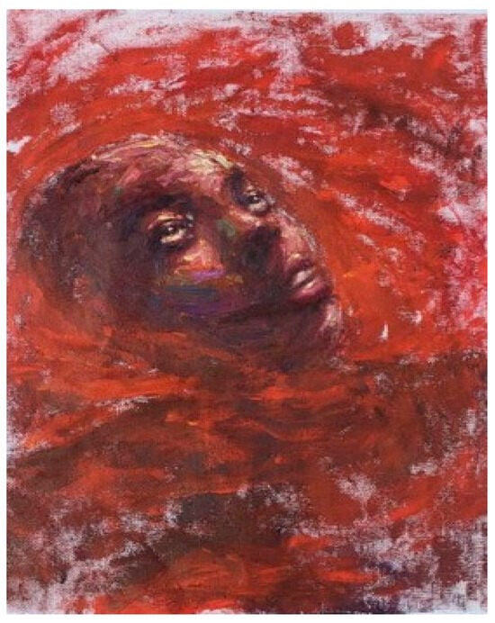 Chigozie Obi, a Nigerian visual artist, contributed to the #EndSARS movement through her involvement in the Protest Art Live Painting event at Lekki Toll Gate on 17 October 2020. Organized by the art community led by herself, Ayo Sanusi, and Kehinde BB, other artists who participated in the session include Tunde Lasisi, Donna Duke, Jemima Arayela, Oluwaseun Akinlo, Julius Agbaje, Sotonye Jumbo, Ken Nwadiogbu, and others. This initiative invited artists to create works on-site to raise awareness and funds for the cause. Obi’s oil-on-canvas painting Ezu River was one of the event’s emotive pieces as it depicts a young boy floating lifelessly in a blood-red river, his pale form and unblinking eyes stark against the gory expanse (see Figure 6). The proceeds from the sale of the artwork, along with those from other works created during the live session, supported legal aid for protesters and SHquseNG, an organization that aids queer activists (). This highlights art’s dual role as both expression and action.