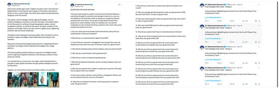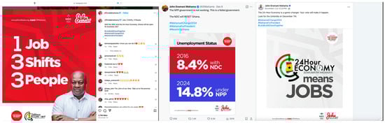 Additionally, Mahama contextualized the 24-h economy within Ghana’s economic crisis, framing it as a solution to inflation, currency depreciation, and youth unemployment. His infographics provided comparative statistics, such as the claim that unemployment had risen from 8.4% in 2016 to 14.8% under the NPP government, effectively framing his opponent as responsible for economic mismanagement. His strategy was highly interactive and policy-focused, using specific issue frames such as “economic reset”, “24-h economy”, and “job creation” to position himself as a reformer responding to Ghana’s economic crisis.