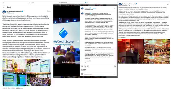 Figure 2 illustrates how Bawumia frequently frames Ghana’s economic future through digitalization and private-sector engagement. The X post (first image from the left) highlights the launch of the ‘CitizenApp’, where he asserts that digital innovation is crucial for improving governance efficiency and public service accessibility. The Instagram post (middle image) showcases his introduction of ‘myCreditScore’, a credit scoring system aimed at improving financial inclusion and access to credit for all Ghanaians. The Facebook post (right image) reinforces his position that the private sector is the foundation of economic growth, as he engages with business leaders to outline tax reforms and policies aimed at fostering entrepreneurship. These posts align with his broader and frequent campaign message of continuity, economic modernization, and technological advancement as key drivers of Ghana’s future development.