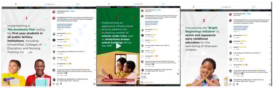 Figure 3 shows how Mahama frequently centered his education campaign on affordability and infrastructure development. The first Instagram post (left) highlights his proposal for a “No-Academic-Fee” policy, aimed at eliminating first-year tuition fees for public tertiary students. The second post outlines his plan to improve school infrastructure by addressing the issue of schools under trees and rehabilitating abandoned school buildings. The third post promotes the “Bright Beginnings Initiative”, which focuses on strengthening early childhood education.