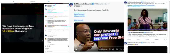 Bawumia framed his education campaign around the continuity and protection of the Free Senior High School (SHS) policy. His social media posts across Instagram, Facebook, and X highlight the government’s achievements in providing free education to over 1.8 million Ghanaians. By emphasizing the need to ‘protect’ Free SHS, this approach created a sense of urgency among voters who had directly benefited from the policy, warning that a change in leadership could put Free SHS at risk. Through the use of bold text, hashtags such as #Bawumia2024 and #VoteNumber1, and long documentary video content featuring classroom scenes, Bawumia’s campaign visually communicated his commitment to maintaining and improving the initiative. His social media captions frequently reinforced this message, stating, “We cannot allow Free SHS to be taken away. Vote to protect the future of Ghana’s children”. While this strategy effectively promoted continuity and leveraged the incumbency advantage, it lacked the detailed policy proposals that characterized Mahama’s campaign.