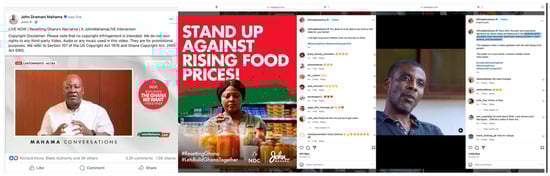 Across the dataset, it was observed that Mahama’s campaign adapted to the affordances of each social media platform, using Facebook Live for interactive Q&A sessions, Instagram Reels for visually engaging policy presentations, and X for real-time debates and direct voter interaction (see Figure 1, Figure 3, Figure 5 and Figure 7). This tailored approach allowed him to create a more engaging campaign space, where voters felt actively involved in discussions about economic and educational policies. In contrast, Bawumia’s digital strategy was less structured and relied more on showcasing campaign events, such as rallies, project inaugurations, and public appearances, rather than fostering direct interaction with voters (see Figure 2, Figure 4, Figure 6 and Figure 8). His approach focused more on visibility through social media posts that summarized campaign events and speeches rather than engaging in interactive policy discussions. Notably, his lower engagement across Facebook, Instagram, and X suggests that a passive approach to digital campaigning is less effective in generating voter engagement and fostering meaningful political discourse compared to a strategy that effectively utilizes platform-specific affordances (see Table 4 and Table 5).