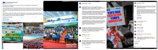 On Facebook, Mahama utilized Facebook Live sessions, branded as ‘Mahama Conversations’, to engage voters directly in real-time discussions about economic and educational policies. This interactive format allowed for two-way communication and reinforced his image as a candidate who was open to public discourse and policy debate. His use of infographics and detailed captions provided voters with clear explanations of his policy proposals and ensured that his messaging was both accessible and informative. Furthermore, his consistent hashtag usage created a coherent digital identity and made his campaign themes easily searchable and recognizable. On the other hand, Bawumia used Facebook primarily for event updates, such as project inaugurations, campaign tours, and past achievements (see Figure 6). His engagement was more one-directional, focusing on highlighting accomplishments rather than fostering dialogue. Additionally, his inconsistent hashtag usage weakened his campaign message and made it less unified across the platform.