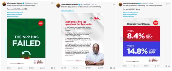 It was observed across the dataset that Mahama did not merely highlight economic struggles across his social media platforms; he positioned himself as a candidate focused on practical solutions by presenting clear and policy-based interventions. His “24-h economy” was the centerpiece of his economic messaging, framed as a transformative policy that would create jobs, expand production, and stabilize the economy. The use of repetition and visual branding, including infographics illustrating job creation policies and proposed tax reductions, strengthened his economic argument. Mahama’s hashtags (#ResettingGhana, #Mahama4Change2024, #LetsBuildGhanaTogether) created a unified campaign identity, which ensured that his messaging remained consistent and was easily searchable across platforms.