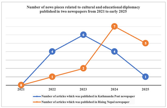 Number of news pieces related to Cultural and Educational Diplomacy between China and Nepal which was published in Rising Nepal and The Kathmandu Post newspapers from 2021 to early 2025. Source: Survey Data (2025).