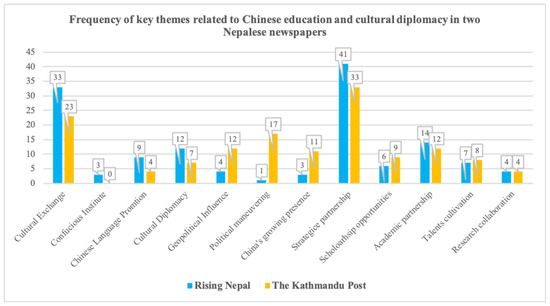Comparison on frequency of key themes related to Chinese education and cultural diplomacy to Nepal published in Rising Nepal and The Kathmandu Post newspapers from 2021 to early 2025. Source: Survey Data (2025).