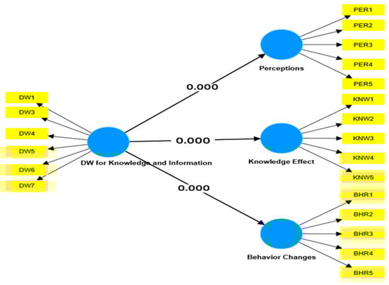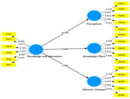 Table 5 outlines the coefficient of determination (R2) values for the constructs within the SEM, alongside with effect size test (f2). These R2 values represent the proportion of variance in each dependent variable explained by the independent variable (e.g., exposure to DW’s coverage). Higher R2 values indicate that the model effectively accounts for variance in the dependent variables. For perceptions, the analysis indicates that DW’s coverage explained 33.8% of the variance in the respondents’ perceptions of the Syrian crisis (R2 = 0.338). This moderated effect highlights the DW’s significant role in shaping how Syrian immigrants perceive the crisis. The remaining variance may be attributed to factors such as personal experiences, exposure to other media sources, or cultural biases. Furthermore, the effect size (f2) was run and indicated perceptions and knowledge. The analysis indicates a moderate effect, while behavioural changes suggest a large effect.
