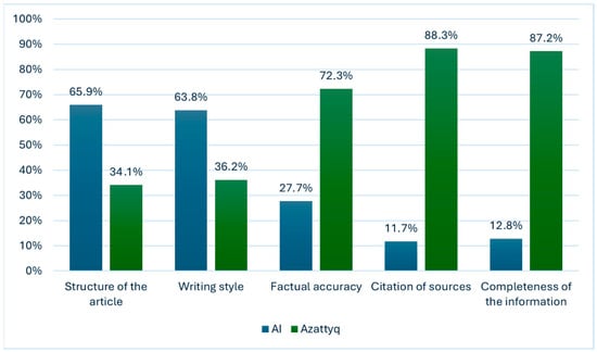 This study employs a comparative analysis method to examine the differences and similarities between articles written by artificial intelligence and those created by traditional journalists. To achieve this, we selected articles generated using generative language models (GPT-4) and materials published by major news agencies in Kazakhstan, including Azattyq, Inform.kz, Sputnik.kz, Zhas Alash, Minber.kz, and Tengrinews.kz. These media outlets were selected because they are among the most widely recognized and influential news organizations in Kazakhstan. Each outlet covers a broad range of topics, including politics, economics, law, sports, education, and social issues, making them highly relevant for this study.