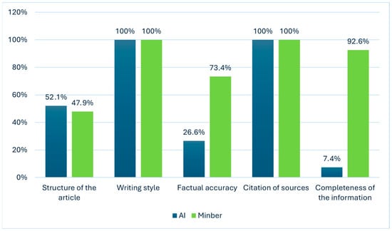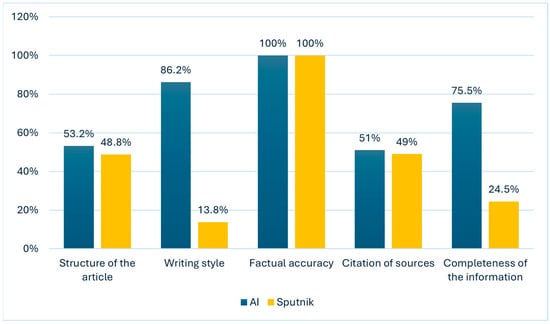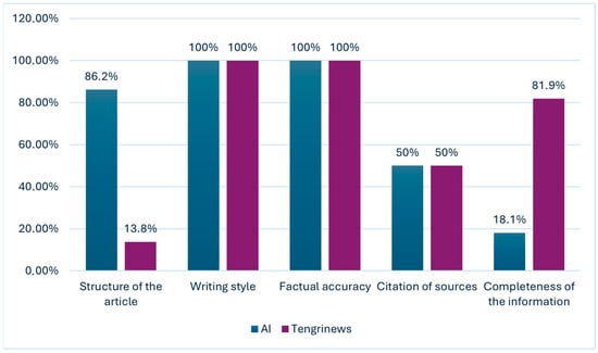 Participants were given articles with the authors’ names removed and asked to evaluate the texts based on criteria such as the reliability of the article structure, writing style, factual accuracy, citation of sources, and completeness of information. The questions were closed-ended and used a comparative format—participants were asked to choose which of the two articles (AI-generated or journalist-written) performed better for each criterion. These five core questions were replicated across all six topic areas, resulting in a total of 30 comparative responses per participant. A total of twelve articles were presented to the survey participants—six generated by artificial intelligence and six written by professional journalists. The survey was conducted online via Google Forms.