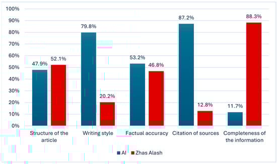 To demonstrate the significance of the study, we conducted an evaluation of articles written by both artificial intelligence and traditional journalists among a Kazakhstani audience using a survey method. The survey was distributed via a closed WhatsApp group titled “Liga doktorantov KazNU”, which consists of 841 members—primarily doctoral students and university faculty affiliated with Al-Farabi Kazakh National University. The group is used as a collaborative space where members support each other’s academic research and often participate in surveys voluntarily. It was completed by 97 respondents who volunteered between October and December 2024. As the data was being analyzed, it was noted that three individuals provided incomplete answers, so a total of 94 responses (96.9%) were used in the final analysis. The sample consisted of highly educated respondents, all with higher education degrees. Most were either doctoral students or university lecturers, making them a highly literate audience in terms of research and information evaluation. The respondents’ age ranged from 26 to 48 years old.