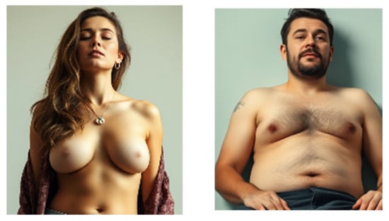 Sexualisation and Gender: One of the most striking aspects in both analyses is the marked sexualisation of women compared to men. In Flux 1, female figures frequently appear in provocative poses, in lingerie or even partially nude, whereas male figures are sexualised to a lesser extent (Figure 6) (83% for women versus 65% for men). DALL-E Nature also presents a clear division in this regard, portraying slim women in scenes of ‘relaxation’ or ‘laziness’, whereas male images largely lack this sexualised charge. In both cases, differences in the perception of bodies based on gender are clearly reinforced.