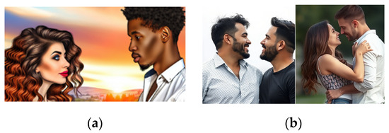 Couples and Racial Diversity: While DALL-E Nature (Figure 7a) is characterised by a more ethnically diverse representation—showing images in which protagonists are Arab, Asian, Caucasian, etc.—Flux 1 is notable for presenting 75% of its generated images featuring Caucasian men and women, without significant racial diversity. The representation of same-sex couples (Figure 7b) is slightly more visible in Flux 1 (30%) compared to the complete absence of such representations in DALL-E Nature, which has not generated a single image depicting same-sex couples.