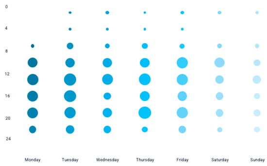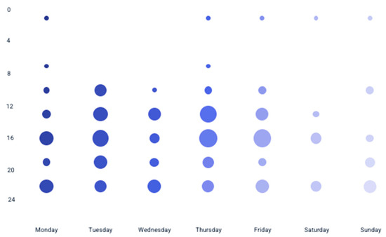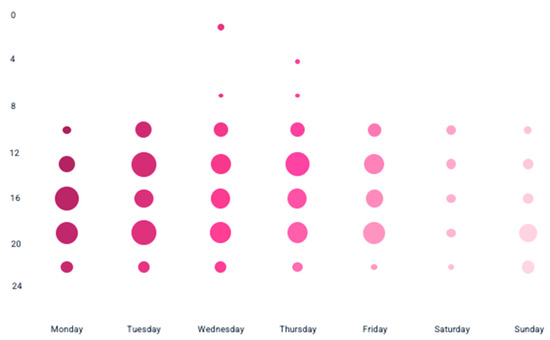 On TikTok, the busiest days were Mondays, Tuesdays and Thursdays, with an increase in interaction between 16:00 and 20:00 (Figure 6).