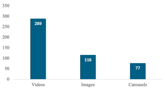 Video was the most used format, which is consistent with the nature of the platform, where dynamic and audiovisual content dominates communication strategies (Figure 7).