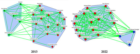 Actor-discourse coalition network on the 2013 and 2022 fuel price increase in Kompas.com. Source: Results processed using Visone, 2024.