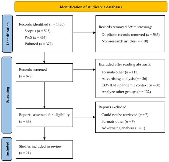 Structured searches were conducted in three databases recognized for their relevance in Social Sciences and Communication: Scopus, Web of Science (WoS), and PubMed, the latter included to capture interdisciplinary studies with public health, gerontology, or social psychology approaches addressing media representations of ageing. The search strategy balanced sensitivity (capturing the maximum relevant articles) and specificity (excluding irrelevant literature), using Boolean operators and terms in English and Spanish.