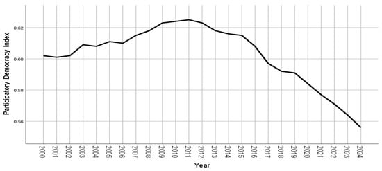 Long-term dynamics of the Participatory Democracy Index from 2000 to 2024. Average values of EU member states. Data sources: V-Democracy. https://www.v-dem.net/data_analysis/VariableGraph/, accessed on 25 April 2025.
