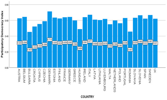 Taking into consideration the geographical distribution, we underline the fact that the highest scores of PD are found in Northern and Western EU member states. In this respect, Denmark (PD = 0.713, ), Sweden (PD = 0.667, , Belgium (PD = 0.644, ), and Germany (PD = 0.643, are relevant examples of an increased level of participatory democracy index. In contrast, Southern and Eastern EU member states are characterized by the lowest scores of democratic participation: Croatia (PD = 0.522, , Hungary (PD = 0.488, ), Romania (PD = 0.457, ), and Bulgaria (PD = 0.453, . Figure 2 presents the average values of the PD in EU member states.