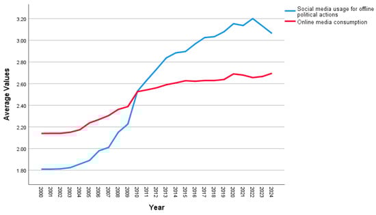 The dynamics of social media usage for offline political actions and online media consumption in EU member states. Average values in log-term statistical series 2000–2024. Data sources: V-Democracy. https://www.v-dem.net/data_analysis/VariableGraph/, accessed on 25 April 2025.