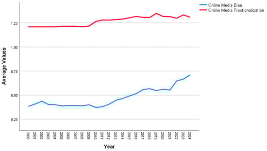 The dynamics of online media fractionalization and online media bias in EU member states. Average values in log-term statistical series 2000–2024. Data sources: V-Democracy. https://www.v-dem.net/data_analysis/VariableGraph/, accessed on 25 April 2025.