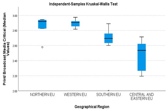 Quantitative results confirm significant differences between geographical regions for several research variables, such as online mobilization for democracy, print/broadcast critical media, online media bias, online media fractionalization, and political polarization. Regarding regional differences in democracy mobilization, statistical results indicate that countries in the Southern part of the EU have high median values of online mobilization (OMD = 1.70, . Another important value is specific to Central and Eastern European countries (OMD = 1.19, . Statistical values from the Central-Eastern and Southern parts of the EU could signify the presence of civic activism in the face of political and economic dysfunctions and a collective reaction to social and political polarization. An important issue with significant differences between geographical regions is that traditional media, measured by print and broadcast media, is critical. This variable encompasses both the “watchdog” and “freedom of speech” functions of traditional media in democratic societies. Therefore, statistical results confirmed that Northern (PBMC = 2.91, and Western (PBMC = 2.90, ) countries have increased values in the field of the critical role played by traditional media (both print and broadcast). In Northern and Western EU member states, traditional media tends to fulfill a more pronounced critical function. In these regions, both print and broadcast media act as “watchdogs” and foster informed public discourse. Both “agenda-setting” and “watchdog” roles ensure an increased level of political participation and democratic accountability in these societies. In contrast, in Central and Eastern European countries, we observed the lowest scores related to the critical role played by traditional media (PBMC = 2.53, ). Figure 5 highlights the regional differences between EU member states in the field of traditional media.