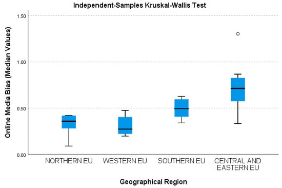 Based on these assumptions, we observed that online media fragmentation and online media bias are relevant variables with significant differences between geographical regions. In the field of online media fractionalization, we estimated that Northern countries registered the lowest values (OMF = 0.372, . In contrast, Southern (OMF = 1.46, and Eastern European countries (OMF = 1.24, have registered the highest scores in the field of online media fractionalization. An important result is estimated in the field of online media bias. Northern (OMB = 0.35, and Western (OMB = 0.27, countries are more likely to be correlated with decreased levels of informational bias. In this respect, fully democratic countries are based on civic culture, participatory democracy, and informed citizens. At the opposite pole, Southern (OMB = 0.49, and Eastern (OMB = 0.712, countries are characterized by an increased level of media bias. Figure 6 presents the distribution of median values related to online media bias by geographical region.
