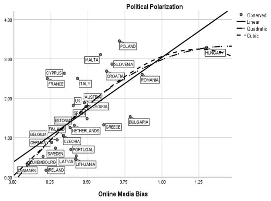 Relevant examples of countries with a low level of online media bias are Denmark (OMB = 0.09), Sweden (OMB = 0.281), Belgium (OMB = 0.292), France (OMB = 0.225), and Luxembourg (OMB = 0.197). In Southern and Eastern countries, the statistical results indicate an increased level of online media bias in countries such as Croatia (OMB = 0.626), Greece (OMB = 0.607), Spain (OMB = 0.494), Italy (OMB = 0.430), Poland (OMB = 0.713), Bulgaria (OMB = 0.786), Romania (OMB = 0.867), and Hungary (OMB = 1.303). In connection with these results, political polarization has significant differences between geographical regions. In line with the previous results, political polarization registered low values in Northern (PP = 0.635, and Western countries (PP = 1.12, . In contrast to these results, Southern (PP = 2.50, and Eastern countries (PP = 2.60, ) are more likely to be correlated with a high degree of political polarization. To assess the correlation between political polarization and online media bias, we counted the direct effect of media bias on social and political polarization. Therefore, we estimated a moderate positive correlation with R2 = 0.47, p < 0.01. An increased level of online media bias is strongly related to political polarization in countries such as Hungary, Romania, Slovakia, and Poland. Low online media scores are correlated with low levels of political polarization in Western and Nordic democracies. Figure 7 captures the moderate positive correlation between online media bias and political polarization within countries included in the sample.