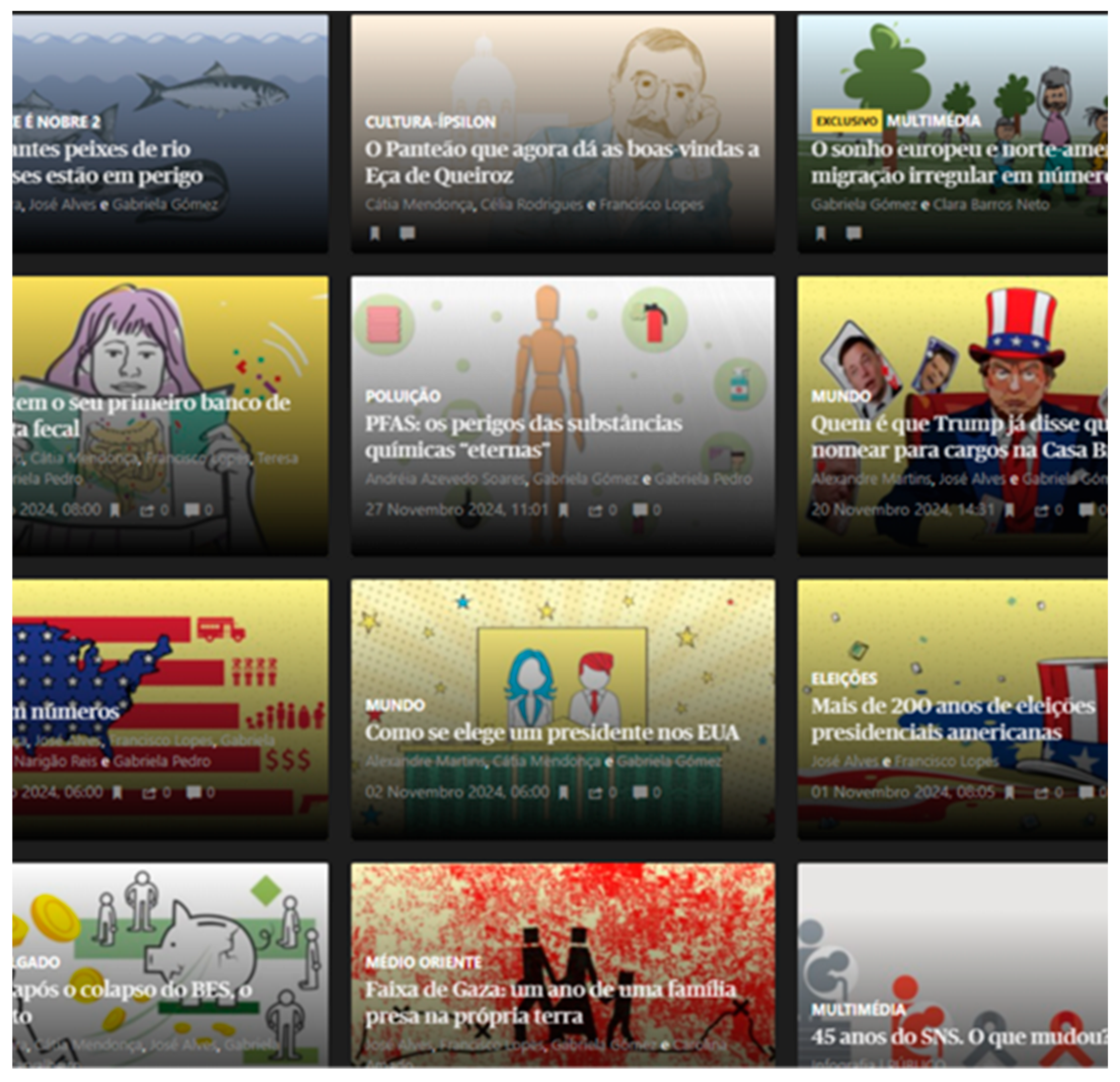 Diversity of the Media Ecosystem: The inclusion of these three outlets captures a broad and representative spectrum of the Portuguese media landscape. Expresso embodies mainstream journalism, with the scale and resources to invest in ambitious multimedia projects; Público exemplifies a daily with a strong digital orientation and an editorial culture committed to experimenting with formats and narratives; while Mensagem de Lisboa represents a hyperlocal, independent digital initiative, demonstrating how aesthetic innovation and community-based resistance can thrive beyond the major corporate media conglomerates. This diversity illustrates that the pursuit of “aesthetic literacy” is not an isolated phenomenon but an emerging tendency across different scales and models of journalism.